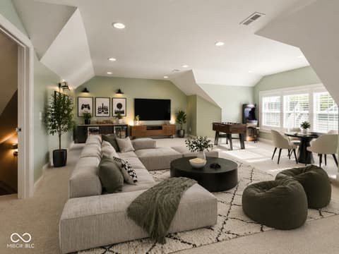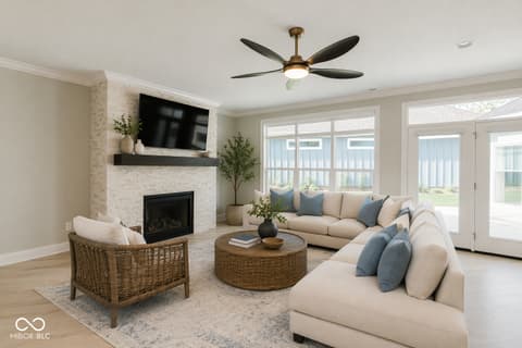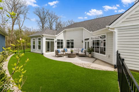 Less than one year old and truly move-in ready, this beautifully upgraded Promenade floor plan by Epcon in The Courtyards of Fishers offers the ease of low-maintenance living in one of the community's most peaceful settings. Tucked along a wooded nature preserve in an intimate neighborhood of just 50 homes, this residence blends thoughtful design, accessibility, and quality finishes throughout. From the covered front porch, a zero-step entry welcomes you into a spacious main living area with a natural flow and plenty of flexibility in how the space can be enjoyed. The kitchen is beautifully appointed with quartz countertops, a large center island with seating, gas range, wall oven, soft-close cabinetry, tile backsplash, pantry storage, and included appliances. The main-level primary suite offers a private sitting room overlooking the courtyard, a generous walk-in closet with Closet Concepts organization, dual vanities, a water closet, and a beautifully finished tile shower. A main-floor den with sliding doors provides an ideal space for a home office, reading room, or music room, while the front bedroom and adjacent full bath create a comfortable setup for overnight guests. Upstairs, a spacious second living area, third bedroom, and third full bath provide excellent separation for family visitors, grandchildren, hobbies, or movie nights. Additional upgrades include motorized window shades, updated lighting, new interior paint, epoxy flooring in the garage, included televisions in the great room and primary suite, and 36-inch doorways and hallways for added function and accessibility. Outside, the private patio, fully fenced low-maintenance turf lawn, and wooded backdrop create a peaceful place to relax, while lawn care and snow removal are included through the monthly HOA!
