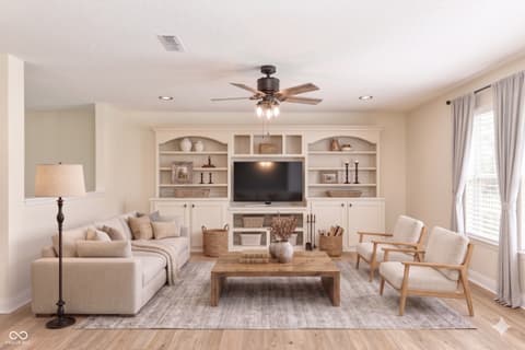 Beautifully renovated, move-in ready 4-bedroom home on premium lot in Fishers. Updated top to bottom with ALL NEW: ROOF, oven, LVP flooring throughout, interior paint, ext. trim paint, doors, storm door, window blinds & lighting fixtures - the primary bathroom light/fan has a bluetooth speaker! Showstopper kitchen with painted cabinets, quartz & butcher block countertops and enormous CUSTOM eat-at island with expansive seating for meals & entertaining. Neutral & bright kitchen is open to great room with CUSTOM built-ins. Huge laundry room w/ extra shelving/storage. Upstairs loft adds even more living space and works as a second family room, workspace, play, exercise or media area. Also find the primary suite with walk in closet, plus 3 more bedrooms (2 w/ walk in closets) and mechanical rm w/ more storage. Enjoy an outdoor swing under the pergola on the deck overlooking the private, tree-lined and fully fenced backyard with pond view (stocked for fishing)! Finished garage with workbench/pegboard, too! Community amenities: 2 playgrounds, trails, basketball court and gazebo. Minutes from Hamilton Town Ctr shopping/dining/entertainment and all Fishers has to offer! Easy access to interstate for commute. Highly-rated Hamilton Southeastern Schools.