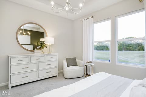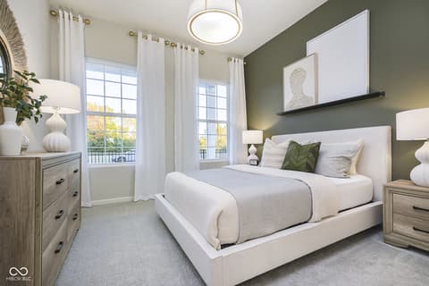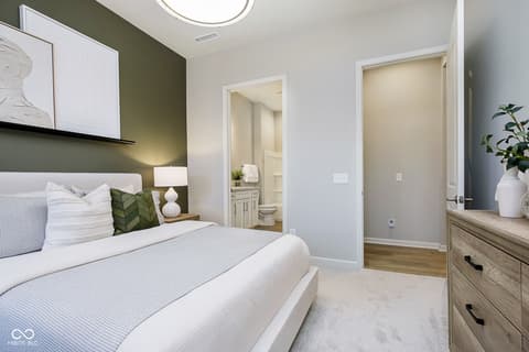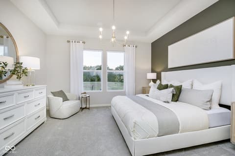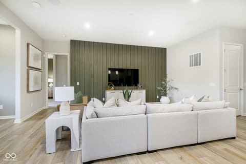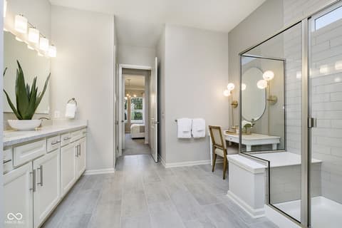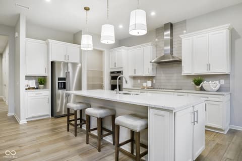 Step into the thoughtfully designed Prestige floor plan at Finch Creek by Del Webb, where style meets functionality and convenience. The heart of the home is the gourmet kitchen, boasting 42" white cabinets, Cashmere Taj 3 cm quartz countertops, a tile backsplash, and stainless steel built-in oven and microwave and gas cooktop. Perfectly positioned, the kitchen flows seamlessly into the gathering room and dining cafe area which opens onto a patio-ideal for entertaining or relaxing. A flex room with doors provides versatile space for an office, hobby room, or quiet retreat. The owner's suite is a true haven, featuring an en-suite bath with quartz countertops and tiled walk-in shower, complete with luxurious tile finishes. Guests will appreciate the privacy of the second bedroom, which includes its own en-suite bath. The extended finished garage offers ample storage, perfect for stowing seasonal items or creating a workshop space. The Finch Creek by Del Webb community is where lifestyle takes center stage. Residents enjoy TV streaming and internet included, plus convenient seasonal opening and closing of irrigation systems. The resort-style amenities include indoor and outdoor pools, a state-of-the-art fitness center, pickleball and bocce ball courts, and a clubhouse featuring social programming led by a full-time Lifestyle Director. A high-tech simulation room offers virtual golf and other sports, while 8.5 miles of walking trails, pocket parks, and a dog park encourage an active, outdoor lifestyle. Ideally located just minutes from I-69, Hamilton Town Center, top-rated hospitals, golf courses, and downtown Noblesville, Finch Creek by Del Webb offers the perfect blend of tranquility, activity, and convenience. Photos of similar model.