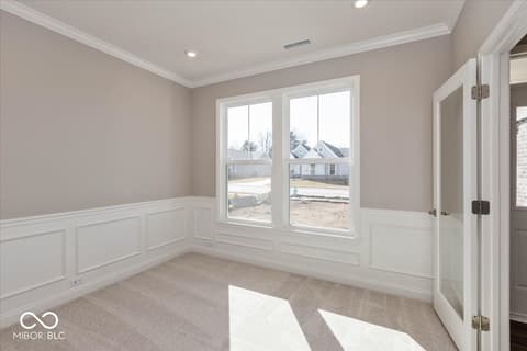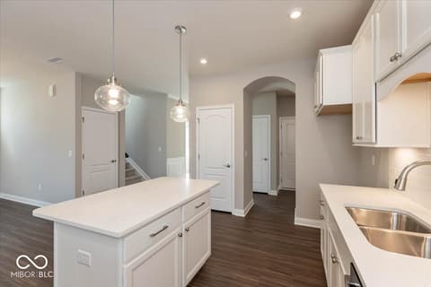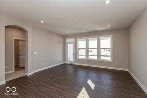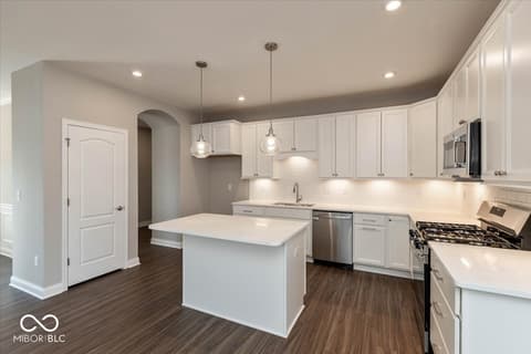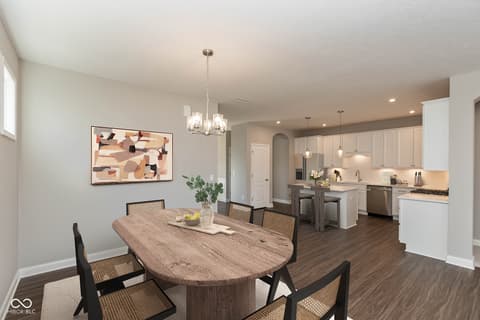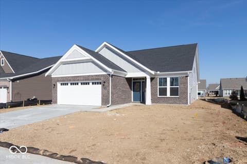 New construction by Fischer Homes in The Cove featuring the Wilmington plan. This home offers an island kitchen with pantry, lots of cabinet space and quartz countertops. Kitchen is open to the dining room, and the dining room opens to the family room with walk out access to the patio. Private, first floor study features double doors. First floor owners suite with huge walk in closet and attached private bath with dual vanity, shower and private commode. Additional first floor bedroom with full bath, and second floor bedroom with full bath and loft. Attached two car garage.