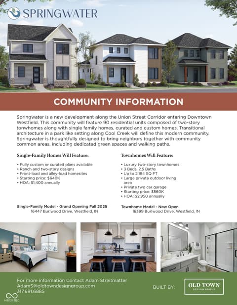Welcome to your dream home, a two-story luxury townhome in the brand new, highly sought-after Springwater neighborhood! Enjoy the lock-and-leave lifestyle in the heart of downtown Westfield built by renowned builder, Old Town Design Group. Your new home offers a perfect blend of modern design and fresh features. With its prime location just minutes from downtown Westfield and Grand Junction Park, you'll enjoy the best of suburban living with shops, dining, and community events just a short bike ride away. Step inside and be captivated by thoughtful design and convenient elegance throughout. The main floor boasts a primary bedroom and ensuite bath - your private retreat. The main floor also features a spacious combo great room and dining area. The open kitchen is an entertainers delight with quartz countertops, curated cabinets and pantry. The expansive great room features a cozy electric fireplace, perfect for relaxing evenings. The adjacent mudroom offers built-in lockers to keep things organized and a convenient main level laundry room. A powder bath on the main offers ease for guests. Upstairs, two additional bedrooms with WIC provide ample storage. A large loft space accommodates your office, playroom or home gym needs! Another generous full bath completes the upper level. Don't miss this incredible opportunity to own a brand-new, thoughtfully designed townhome in a premier location and to be among the first to experience the exceptional lifestyle offered in Springwater.