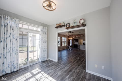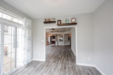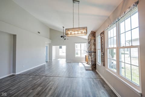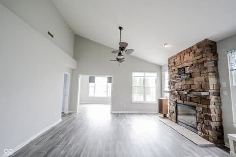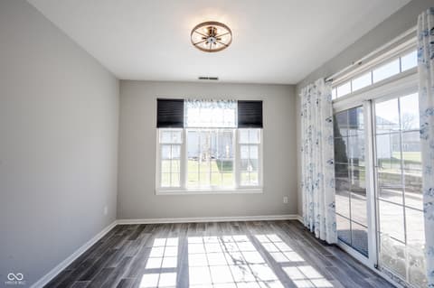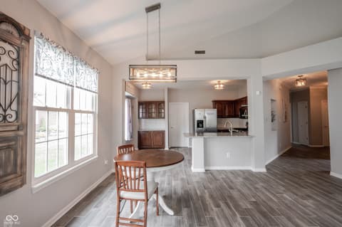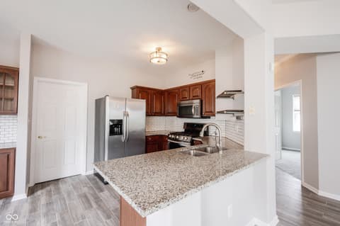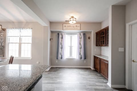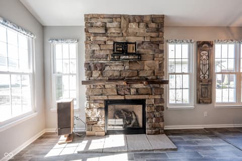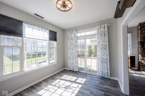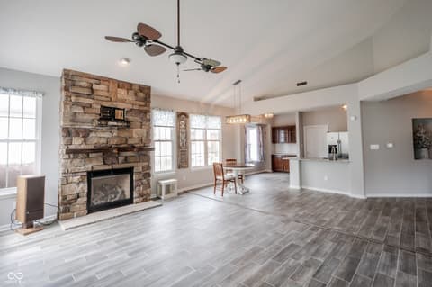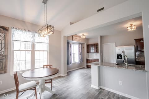 Welcome home to Stone Harbour, a meticulously maintained property, maintenance free exterior community, in the heart of Noblesville! From the moment you arrive, you'll appreciate the community feel and ease that this low maintenance neighborhood provides. No more shoveling! An enhanced entrance with a custom walkway, off the corner lot, really gives this property curb appeal, defining the entrance and standing out among the rest! Upon arrival you experience a light and airy feel with beautiful soaring ceilings and lots of accent walls and nooks, new trending tile plank flooring, that's just stunning! The kitchen boasts granite countertops, tile backsplash, and stainless-steel appliances with tons of cabinet space. There is additional counter space for a coffee bar just off the kitchen. Continuation of the new floors into the greatroom offering plenty of space and an open airy feel with vaulted ceilings. Stately gas fireplace that's surrounded by stone, really makes a statement in this space! Off of the family room, there is an added sunroom that leads out to your patio. The sliding glass door brings in the perfect amount of light for morning coffee and reading. Conveniently The owner's suite is large and features a stunning accent wall. The ensuite bath is complete with custom vanity and dual sinks with shower/tub. WIC closet that provides tons of space! Two generous size bedrooms and a full bathroom tucked off the entrance of the home providing a separate space. Newer windows are making this property more energy efficient! Step outside onto your professionally designed stamped concrete patio surrounded by lush landscape for privacy and a paver wall for additional seating. Extraordinary gas firepit will be the gathering place this spring for a relaxing evening! Conveniently located to all the wonderful things Noblesville has to offer-shops, medical, dining, and recreation! This home is move in ready for you to make it your own! Welcome Home!