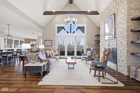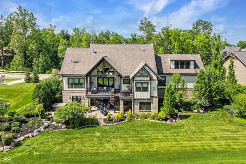 Experience breathtaking design and sophisticated comfort in this custom-crafted Old Town Design Group home, nestled within the prestigious Chatham Hills community. This 2016-built masterpiece offers 6,830 square feet of meticulously crafted living space on a premier lot intentionally situated to offer rare privacy. The home's position creates an expansive feel, framed by lush, dense woods directly behind the property and a tranquil pond to the side. This exceptional golf course residence is a destination for refined living and effortless entertaining. The main level invites you in with soaring cathedral ceilings, exposed wood beams, and a grand stone fireplace anchoring the vaulted great room. Elegant hardwood flooring flows into the gourmet kitchen, which features custom cabinetry, appliances, an expansive center island, breakfast bar, walk-in pantry, and high-end double ovens. The primary suite serves as a quiet retreat on the main floor, with a spa-like bathroom and a custom walk-in closet. A 2nd main floor bedroom and ensuite is perfect for guests. The upper level features two well-appointed bedrooms joined by a Jack-and-Jill bath and a versatile loft lounge, perfect for a second family room or study, and a second laundry room adds to the upper level functionality. The finished walk-out lower level is tailored for entertaining and unwinding, featuring a custom wet bar, dedicated office, workout room, and a fifth bedroom with direct patio access and a full bath. Outdoor living is breathtaking; an expansive covered terrace and deck overlook the 9th hole and pond, offering a serene, private setting against a lush backdrop of nature. Below, the patio features a built-in fire pit and a private area for a hot tub, creating a luxurious atmosphere for stargazing. Practicality meets luxury with a massive 4-car garage for vehicles and a boat. Enjoy the resort-style lifestyle of Chatham Hills: Pete Dye golf, clubhouse, bowling, fitness center, pools, and nature tr