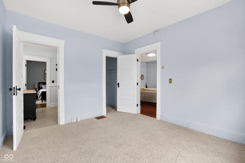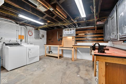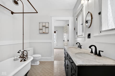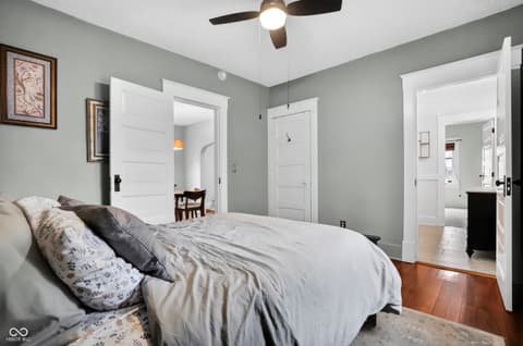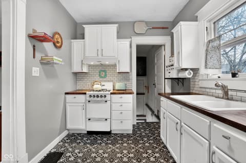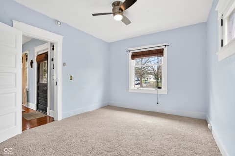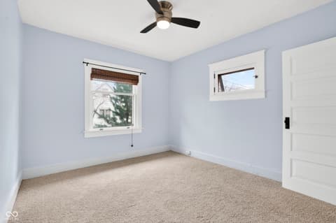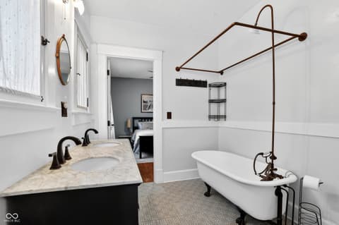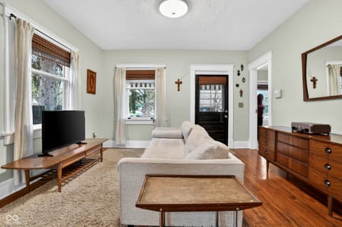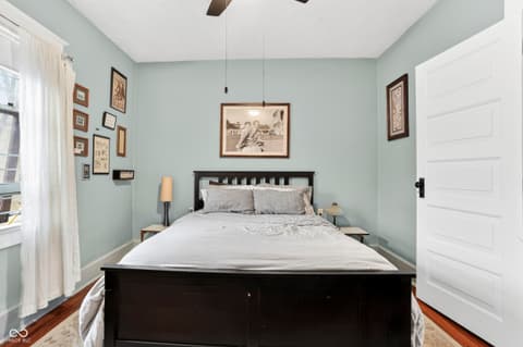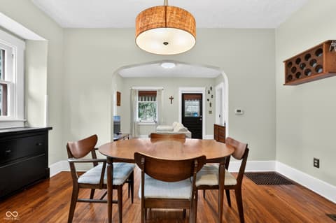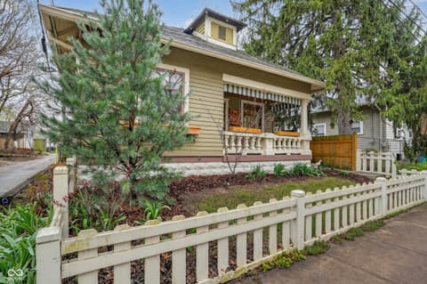 Welcome to this beautifully restored 1920 bungalow in the heart of St. Clair Place-where timeless character meets an effortlessly livable lifestyle. A charming gated entry opens to a thoughtfully designed, low-maintenance front garden and inviting covered porch, perfect for morning coffee or evening unwinding. Inside, natural light pours across original hardwood floors, guiding you from the living room through a striking pointed-arch entry into the dining space with a built-in buffet-ideal for intimate dinners or casual gatherings. The primary bedroom continues the warmth of the hardwoods, while the second bedroom offers fresh updates with new carpet and paint, providing flexibility for guests, work, or creative space. A fully renovated Jack-and-Jill bathroom blends vintage charm with modern ease, featuring a classic claw-foot tub with shower, dual-sink vanity, and timeless tile flooring. The kitchen pairs style and function with a retro gas stove, butcher block countertops, white cabinetry, subway tile backsplash, and tile floors-designed for both everyday living and entertaining. The basement offers laundry, a former woodshop, and generous storage, adding versatility to the home. Outdoors, enjoy a private, fully fenced backyard with a brick walkway and subtle ambient and security lighting-creating a relaxed, easy-care space to gather or recharge. Set in one of Indy's near eastside neighborhoods, this home offers a rare blend of historic charm, intentional updates, and a lifestyle that feels both connected and comfortably your own.