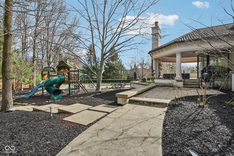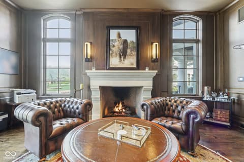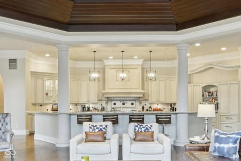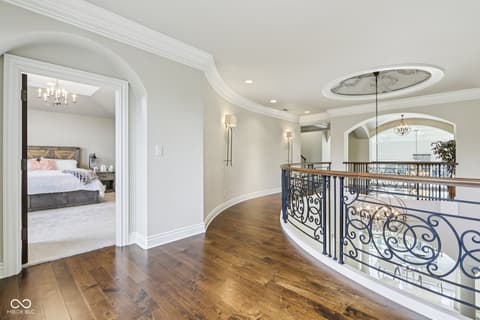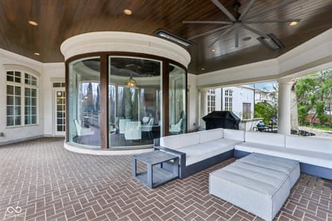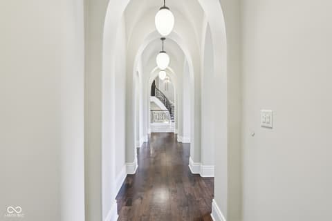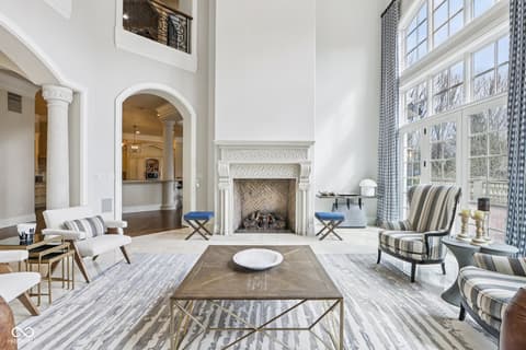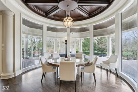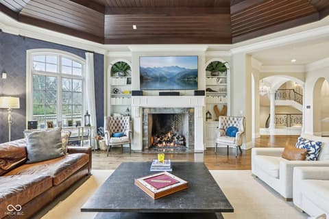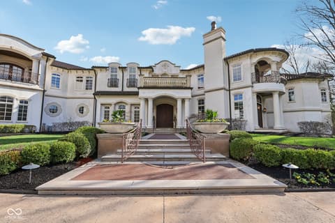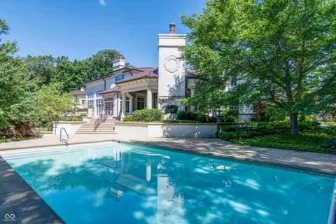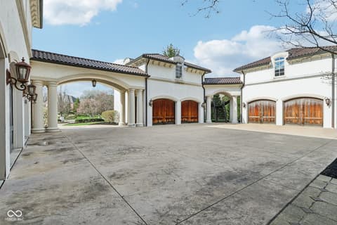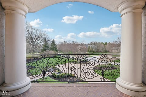 Expertly designed by RJ Klein, this Italianate residence is positioned to take full advantage of its private, nearly two-acre wooded parcel. The interior features luminescent marble floors, warm hardwoods, and detailed wood ceilings. A grand curved staircase leads to the upper levels, while arched doorways and extensive millwork define the formal living spaces. The kitchen overlooks a bright breakfast room and the rear grounds. The walk-out lower level is built for entertaining, featuring a custom bar, theater room, and wine cellar. Outside, the property includes a gunite pool, a covered veranda with a fireplace, and large balconies overlooking the lush, private lawns. High-end finishes and quality architectural details are present throughout every level of this home.