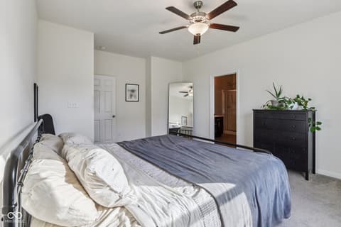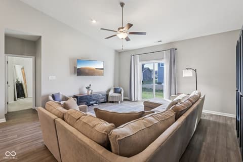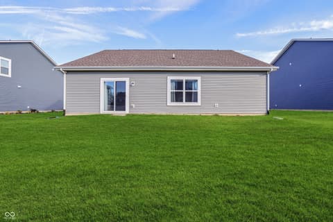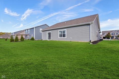 Wonderful MOVE-IN READY 3-bedroom, 2-bath RANCH HOME with FLEX ROOM just off the large entry. A COVERED PATIO welcomes you to this ONE LEVEL LIVING WITH NO STAIRS - your future self will thank you. Built in 2020, this home features a split floor plan, WATER SOFTENER, LOW HOA dues, fully drywalled garage, and the remaining structural warranty will convey to the new owner. Great home with abundant NATURAL LIGHT and VAULTED CEILINGS in the kitchen and great room plus 9-foot ceilings throughout creates a spacious and inviting feel. Welcoming entry with convenient laundry room and separate dining area perfect for home office, flex space, or additional entertaining. UPDATED KITCHEN features shaker-style cabinetry, matte white tile backsplash, cast-iron double-bowl sink, recessed lighting, and a LARGE CENTER ISLAND WITH CABINETS, bar seating and ample prep space. OPEN FLOOR PLAN. Kitchen opens seamlessly to the great room filled with natural light and sliding glass doors leading to the backyard. Privacy fences are allowed if desired. This SPLIT FLOOR PLAN features a PRIVATE PRIMARY BEDROOM SUITE with walk-in closet and en-suite bath featuring walk-in shower and updated lighting. Two additional bedrooms are located on the opposite side of the home and share a full bath, providing ideal separation for guests, family, or work-from-home needs. Prime location just minutes from McCord Square, Geist Waterfront Park, Daniel's Vineyard, hospitals, shopping, dining, and quick access to downtown Indianapolis. This modern ranch home is IMPECCABLE - a VERSATILE LAYOUT in EXCELLENT CONDITION, in a desirable location and in a community that is thriving.