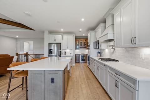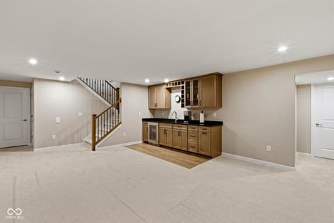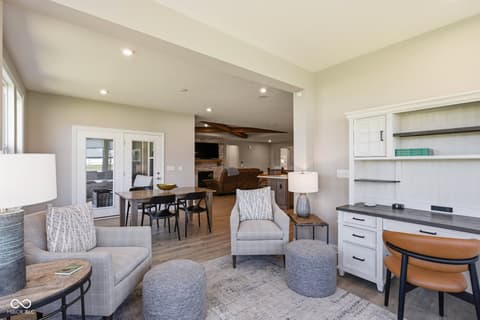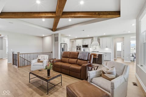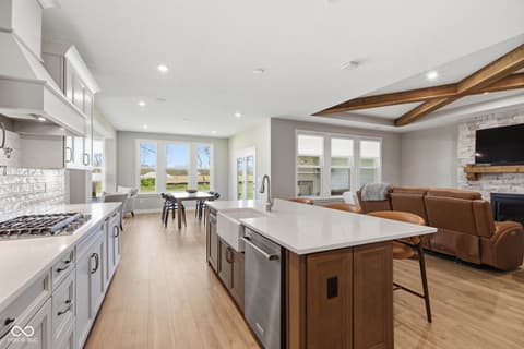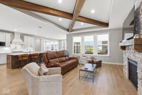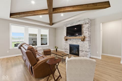 Stunning nearly new 2025-built ranch by Drees Homes with a finished basement sitting on one of the community's premium lots! This home blends style, space, and functionality throughout. The inviting great room features beautiful wood beam accents, a cozy fireplace, and surround sound, perfect for everyday living and entertaining. The kitchen is a standout with abundant cabinet and countertop space, pot filler at the stove, stainless steel appliances, double ovens, and THREE pantries for exceptional storage. A convenient wine bar adds even more function and charm. The dining area overlooks the backyard and covered patio with fireplace, flowing into a bright sunroom for additional living and seating space. Just off the main living area, an additional flex room offers the perfect space for a home office or extra sitting area. The main level master suite offers a private retreat with dual vanities, a soaking tub, glass walk-in shower with floor to ceiling tile, and a spacious walk-in closet. The main level also includes a secondary bedroom with a full bath, a half bath, and a laundry room. The finished lower level provides incredible space for entertaining with a large rec area, wet bar and cabinetry, an additional bedroom and full bath, plus plenty of storage. An ideal lower level for hosting, play space and flexible living. Enjoy the covered patio with fireplace just off the dining room, perfect for relaxing year round. This house also has a central vacuum for added function, irrigation system, garage floor recently epoxied and custom blinds with some being remote controlled! Complete with an oversized 3-car garage, this home truly has it all!